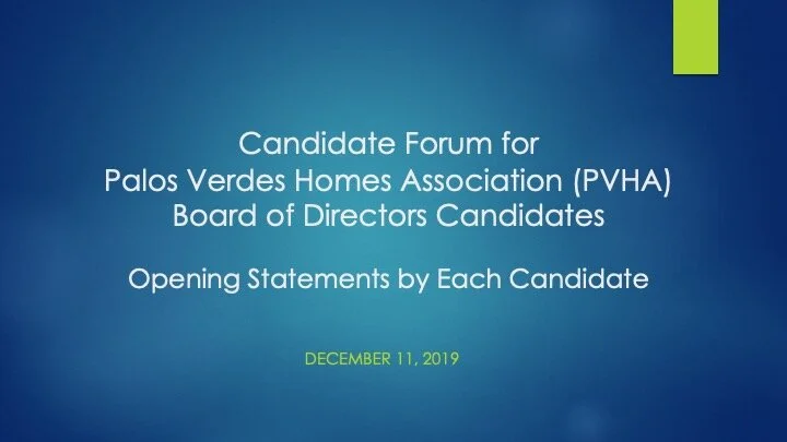 On December 11, 2019, The League of Women Voter hosted a Candidate Forum for the Board of Directors Election of the Palos Verdes Homes Association (PVHA). All six candidates participated in this two hour gathering in PVE City Council Chambers. The questions were selected by the LWV from ones submitted by attendees at the event. This page contains the entire event, and the videos are broken up by question so you’ll find it easier to navigate to the question of most interest to you.